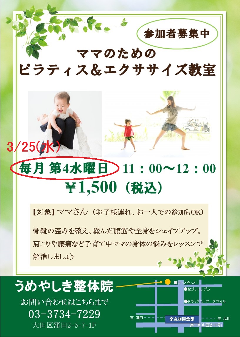 2020年3月 ママのためのピラティス&エクササイズ教室|梅屋敷の整体・カイロプラクティックなら、うめやしき整体院