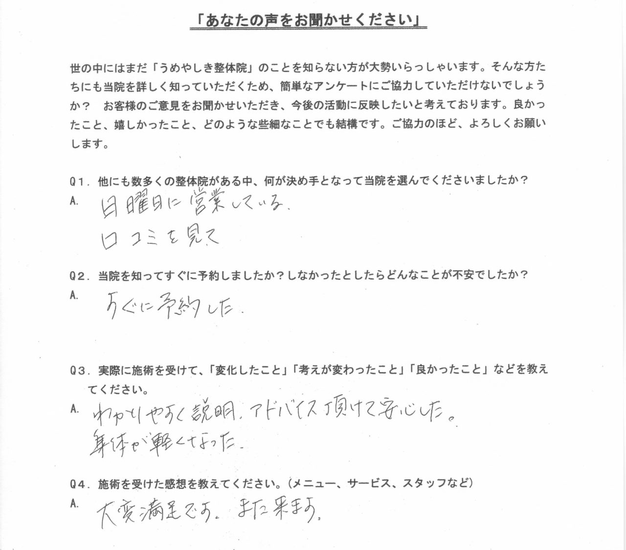日曜日に営業してる! HTさん|梅屋敷の整体・カイロプラクティックなら、うめやしき整体院