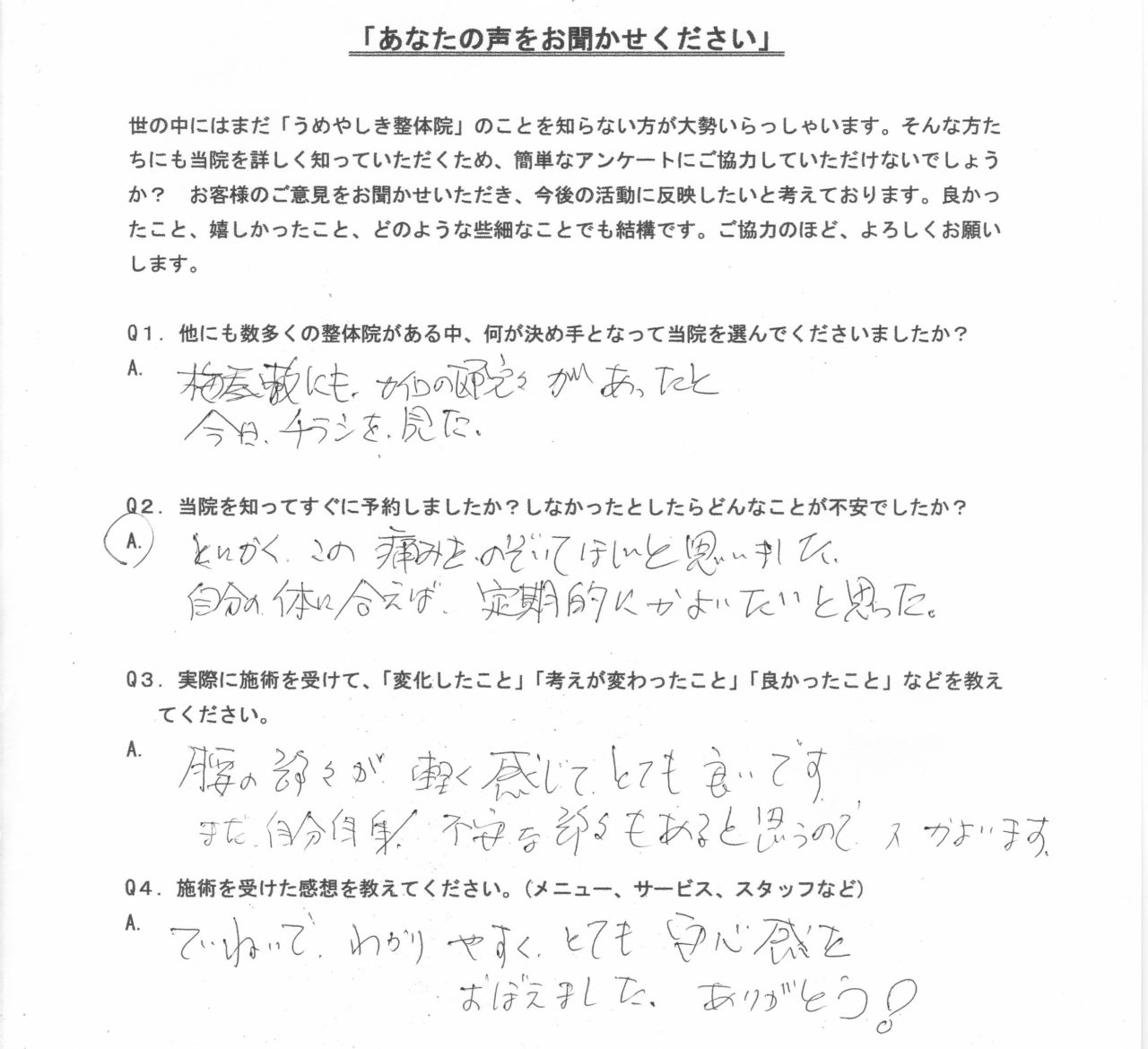 他にも数多くの整体院がある中、何が決め手となって当院を選んでくださいましたか?
