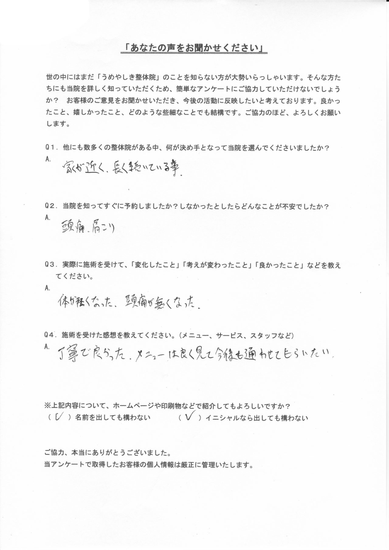 身体が軽くなり頭痛が無くなった YAさん|梅屋敷の整体・カイロプラクティックなら、うめやしき整体院