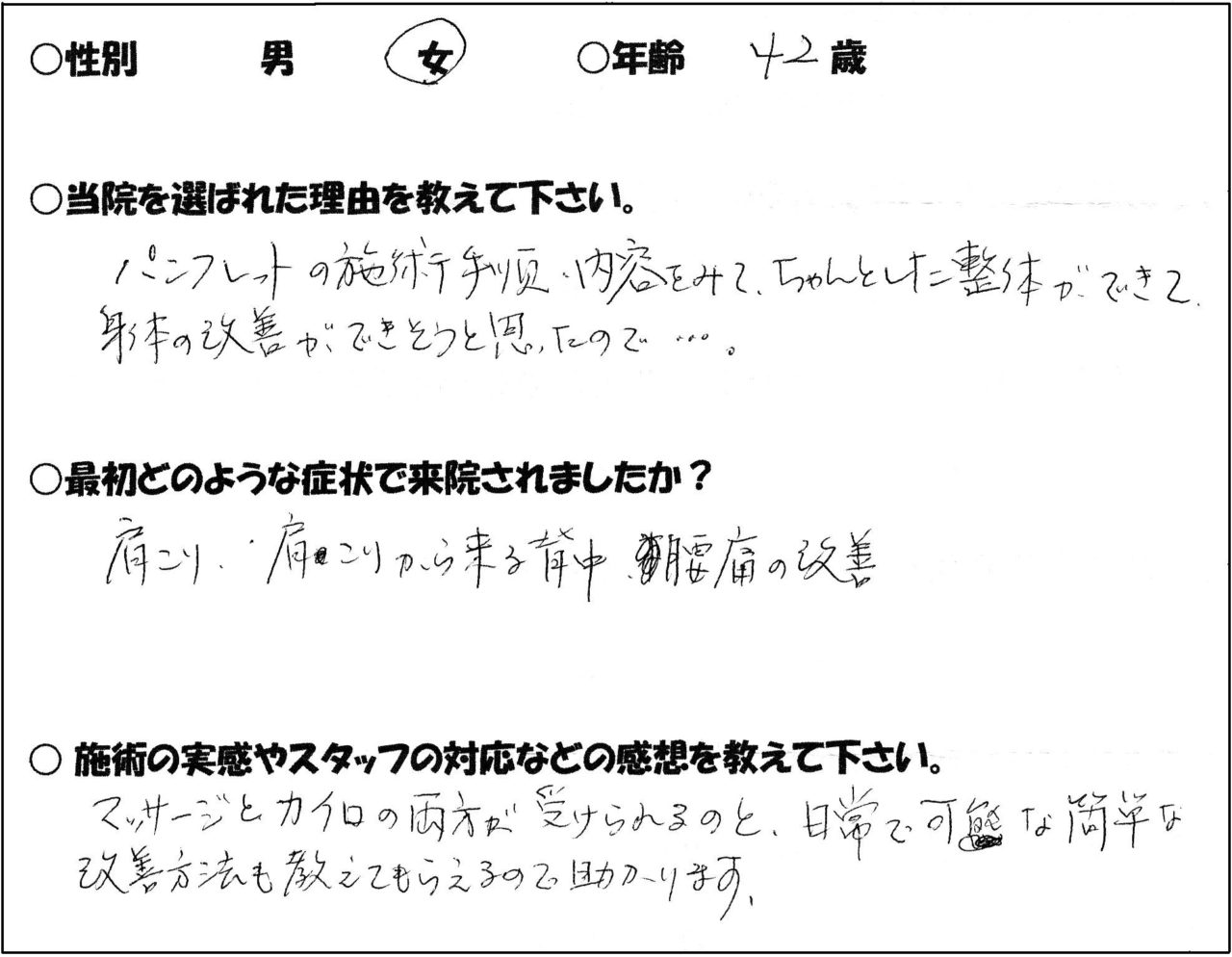 女性 42歳 肩こり|梅屋敷の整体・カイロプラクティックなら、うめやしき整体院